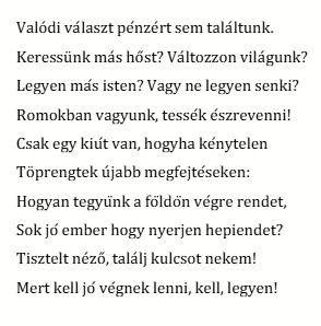 Szereposztás: Régi – Új, Rendszer – Ember, Haszonleső – Igazságkereső, Alvó – Ébredő, Cinizmus – Lelkiismeret, Nihil – Katarzis, Félelem – Remény, Rombolás – Teremtés! … Jin – Jang? Ha nincs rossz, nincs mit legyőznie a jónak?!